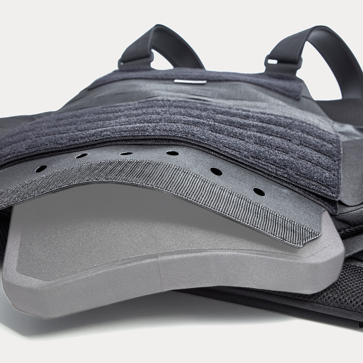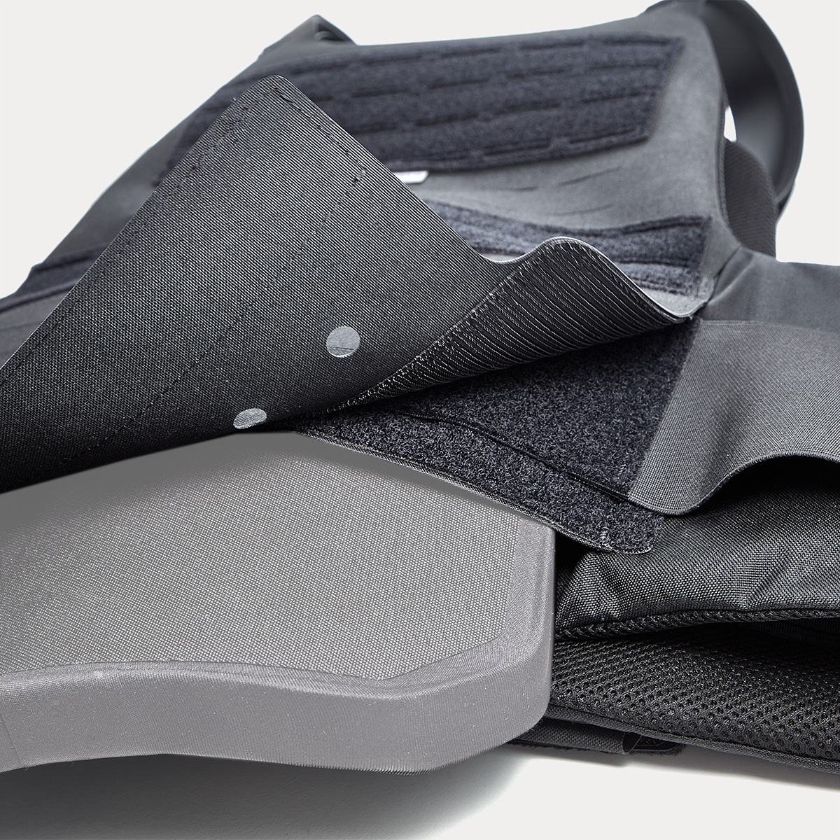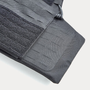 Das integrierte Plattenfach ist nicht einfach auf die Weste aufsetzt, wie es sonst häufig der Fall ist. Bei diesem Kombi-Träger wurde das Plattenfach fest in die Weste eingebunden und sitzt hinter der Kabelebene und vor der Weichballistik-Ebene. Somit behält der Overt Soft Ballistic Carrier auch beim kombinierten Tragen von Weich- und Hartballistik seine schmale Silhouette und trägt nicht auf. Das Plattenfach ist über einen Klettverschluss bedienbar. Die Platte sicherst Du über eine eingenähte Gurtband-Halterung. Diese schützt die Platte auch vor dem Hin- und Herrutschen während einer Bewegung.
