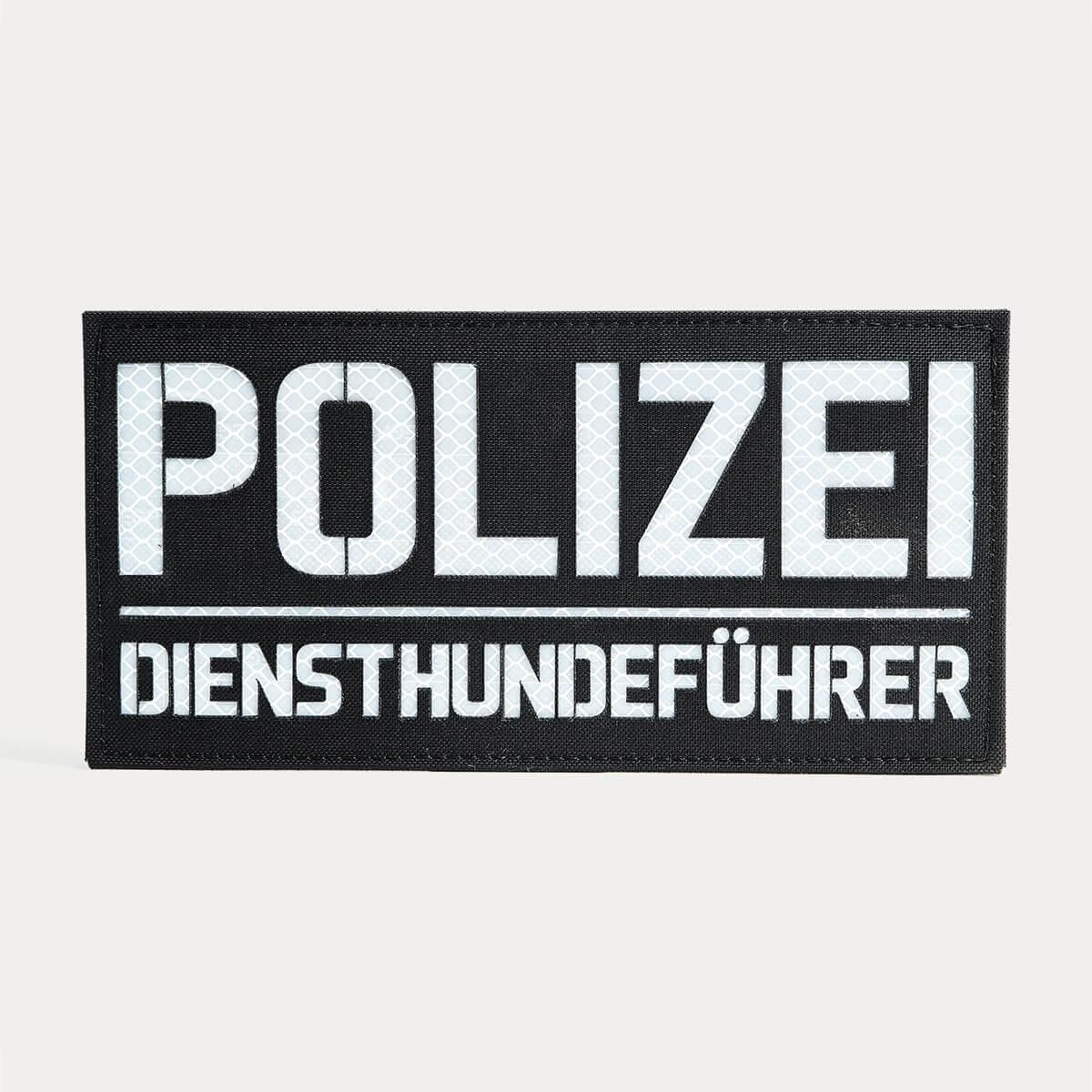 Schmücke Deine Einsatzweste – Damit auch jeder in der Dunkelheit erkennt, zu wem Du gehörst! Gefertigt aus CORDURA® 500 den und weißer Reflexfolie mittels Lasercut-Technik erscheinen die Patches sehr flach und aufgeräumt. Unseren „POLIZEI DIENSTHUNDEFÜHRER“- Patch erhältst Du in der Größe Large. Auch vergünstigt im Set mit dem kleinen „POLIZEI“- Patch erhältlich.