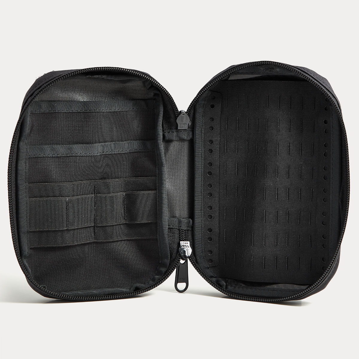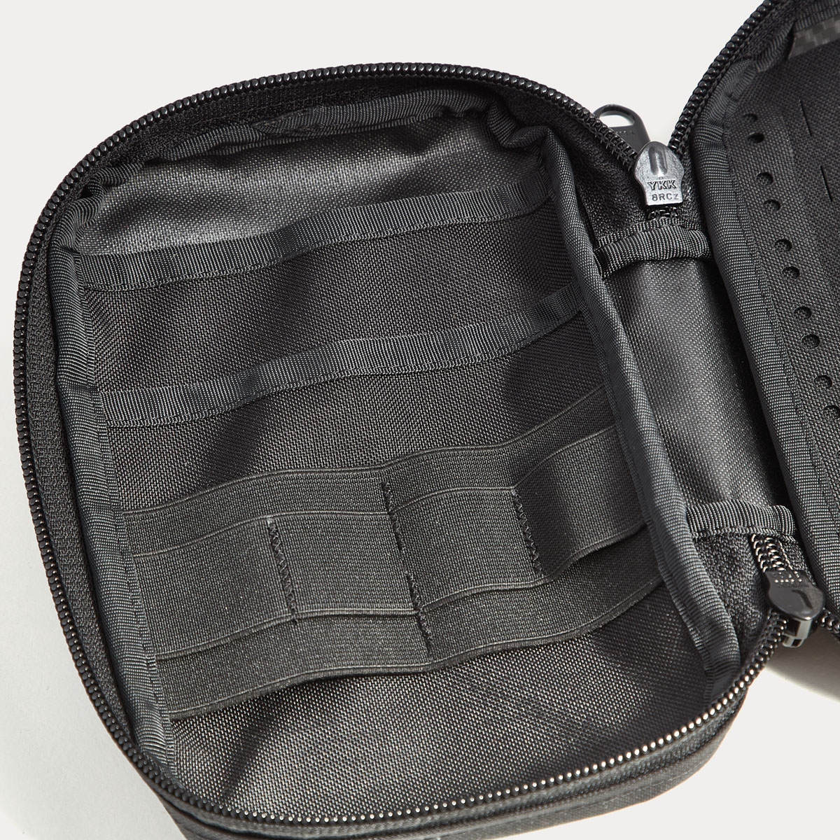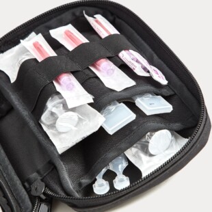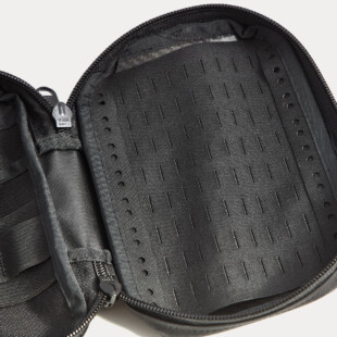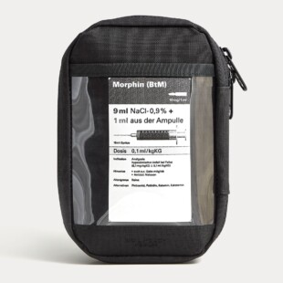 Die verstärkte Rückseite aus dem flexiblen aber gleichzeitig robusten Curv®–Material schützt dabei Deine Glasampullen vor Bruchschäden. Die linke Innenseite bietet durch 2 große Einschubflächen, 2 große und 4 kleine Gummibandslots genug Platz für die zugehörigen Utensilien, wie Spritzen, Aufziehkanülen etc. Ein großzügiges Sichtfenster mit Einschub auf der Pouch-Rückseite ist für Dosierungstabellen oder andere wichtige Informationen für die Medikation vorgesehen. Der Pouch ist außen aus hochwertigem CORDURA®-Material gefertigt und dadurch stark abriebfest und wasserabweisend. Etwaiges Herausfallen des Inhalts wird durch ein rundumgehendes YKK-Reißverschlusssystem verhindert. Auf der Front befindet sich eine Klett-Fläche, um Patches (schreib uns für einen individuellen Patchwunsch – hier) zu befestigen.